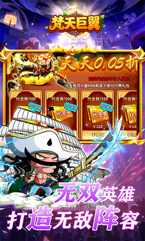 《梵天巨翼》是一款Q版国风题材的卡牌+塔防回合制游戏。你将化身主公,带领英雄们征战天下!烧脑策略秀操作,每个武将也都各具特色,趣味的玩法,休闲的画风,简单的操作,原创“满屏技能释放”,带来燃尽十足的战斗快感,每日福利拉满,永久0.05折,天天送10000代金券,让战斗在你的指尖生动重现。